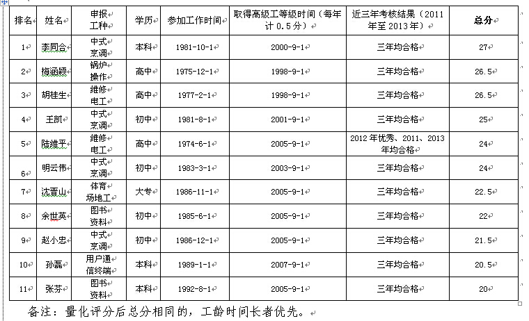根據江西省人社廳《關于開展全省機關事業單位工勤人員崗位等級考核工作的通知》(贛人社發〔2014〕453號)和九江市人社局及學校有關文件精神,學校開展了工勤人員崗位等級考核申報工作。經九江市人社局核定,本次工勤人員崗位等級考核學校有2名技師職數,組織人事部按照《九江學院崗位設置實施暫行方案》(九院字[2014]48號)中《九江學院專業技術和工勤技能崗位競聘量化評分細則》有關規定,組織了相關部門對申報技師人員進行了資格審查和量化評分。依據量化評分情況,學校將從高分到低分等額推薦申報,現將符合申報技師條件人員的量化評分結果公示如下: