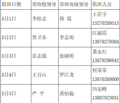 4.請有關部門和人員按要求做好“五一”勞動節放假期間行政樓值班工作(值班安排表附后)。