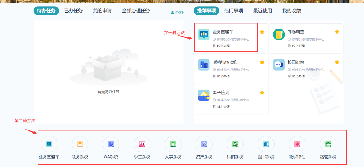 1. 融合門戶已實現辦公系統(含老辦公系統)、人事管理系統、圖書管理系統、教務系統、資產管理系統、科研管理系統、教學平臺系統、學工系統、實驗室系統、宿管系統、教學評估系統的單點登錄。后續將根據業務部門需要,逐步集成其他業務系統。用戶登錄統一身份認證平臺后便可直接訪問有訪問權限的業務系統,不需要再次輸入密碼。具體操作方式如下,訪問業務系統可以打開“首頁”-“推薦服務”中“業務直通車”或業務系統導航條進行點擊跳轉。(如下圖所示)