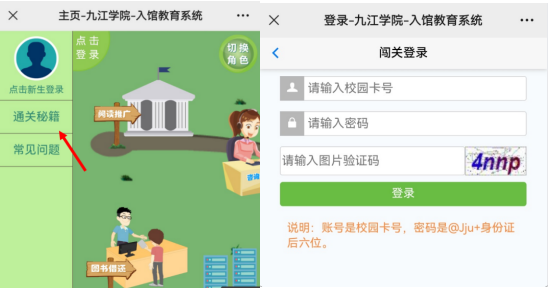依次點擊“開始闖關”“點擊登錄”“點擊新生登錄”圖標,進入“闖關登錄”頁面。闖關登錄,輸入校園卡號和密碼(密碼格式:“@Jju+身份證后六位”)。
