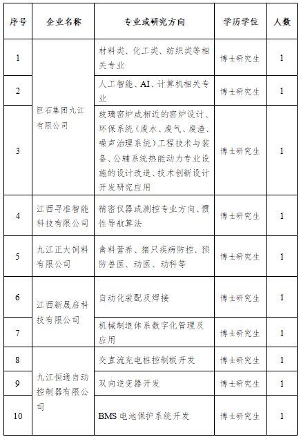 為進一步推動人才復用政策落地,經學校與九江經開區前期對接,現將相關企業博士需求信息發布如下,有意向地博士可通過“2+3”或“全脫產”模式服務企業,詳情請咨詢人事處。