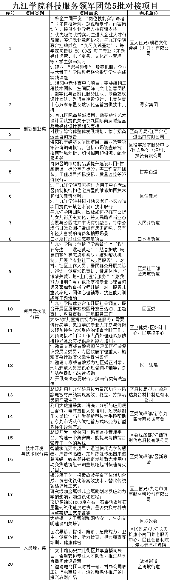 為貫徹落實《九江學院服務九江經濟社會發展三年行動計劃(2024-2026)》(九院黨字〔2024〕66號)文件要求,通過科技服務領軍團對潯陽區經濟社會發展相關需求進行征集,確定以下20項為第5批社會服務項目,現面向全校發布項目信息。