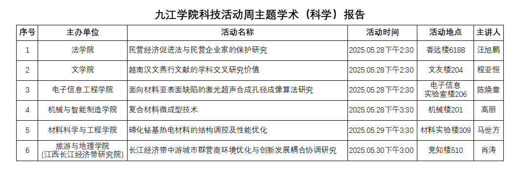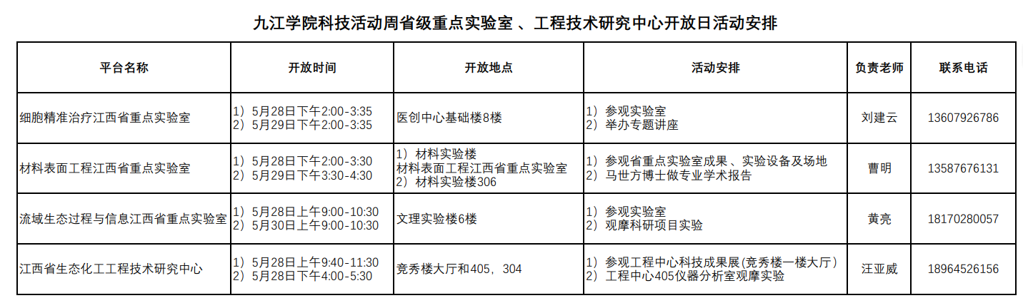 為深入學(xué)習(xí)貫徹習(xí)近平總書(shū)記關(guān)于科技創(chuàng)新的重要論述,廣泛宣傳習(xí)近平總書(shū)記對(duì)科技工作者關(guān)心關(guān)愛(ài),推動(dòng)落實(shí)黨中央科技創(chuàng)新重大決策部署,大力倡導(dǎo)科學(xué)家精神,宣傳推廣基礎(chǔ)學(xué)科知識(shí),在全校形成濃厚的科技文化氛圍,激勵(lì)全校師生堅(jiān)定信念,開(kāi)拓進(jìn)取,根據(jù)2025年全省科技活動(dòng)周安排,學(xué)校決定于5月27日——5月30日期間組織開(kāi)展九江學(xué)院科技活動(dòng)周系列活動(dòng)。現(xiàn)將有關(guān)事宜安排如下: