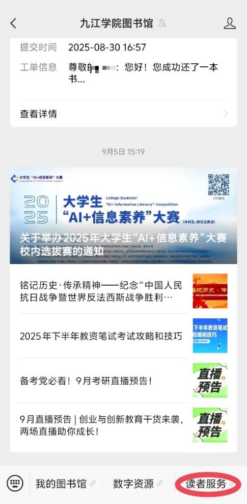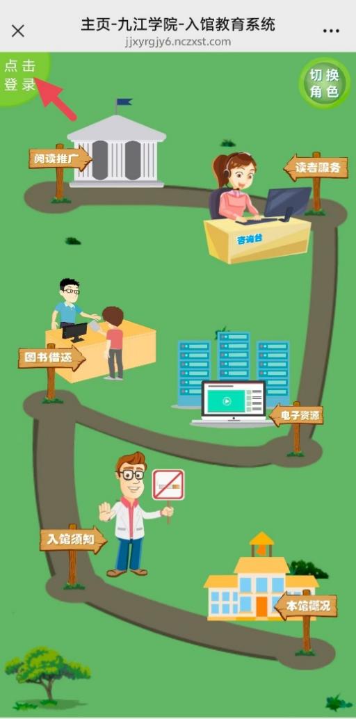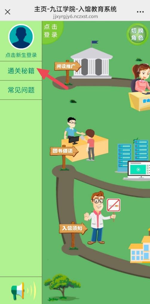 關注“九江學院圖書館”微信公眾號(賬號“jjxy_tsg”),點擊右下角“讀者服務——入館教育”進入游戲闖關頁面。