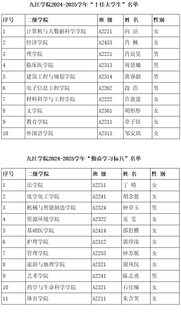 根據(jù)九江學院“十佳大學生”“勤奮學習標兵”評選標準,經(jīng)二級學院審核、推薦,學校“十佳大學生”“勤奮學習標兵”評審委員會評選,擬授予以下21名同學2024-2025學年“十佳大學生”“勤奮學習標兵”稱號,現(xiàn)予以公示: