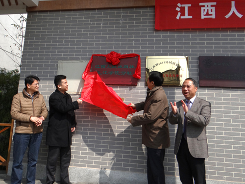 在熱烈的掌聲中,校黨委書記鄭翔,校長甘筱青,江西省出版集團公司副總經理、中文傳媒股份有限公司總經理傅偉中,九江市文化廣電新聞出版局局長柯亨龍共同為學院分社揭牌。江西人民出版社九江學院分社正式宣告成立。