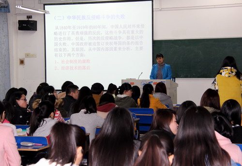 龔老師及同學(xué)們用熱烈的掌聲對吳桃娥副校長一行的到來表示了熱烈歡迎。龔老師從舉例提示入手,讓同學(xué)們列舉近代中國存在的落后腐敗現(xiàn)象,引申和剖析了近代中華民族反侵略斗爭失敗的原因及民族意識(shí)的覺醒,并用簡潔的課件及精彩的影音片段加深了同學(xué)們的直觀印象。