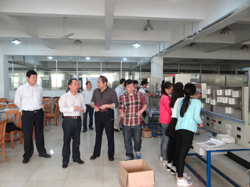 4月2日上午,校長甘筱青來到實訓樓電工工藝實訓室現場觀摩了電子工程學院許勤副教授指導電子B1412班同學的電工工藝實訓課程。學校教務處、實驗中心、電子工程學院、國資處負責同志一同觀摩。