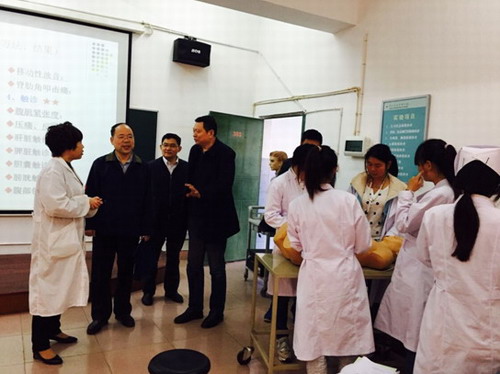 在基礎(chǔ)護(hù)理實(shí)訓(xùn)室,學(xué)生們正在老師的指導(dǎo)下進(jìn)行課外開放訓(xùn)練,紀(jì)副校長饒有興致地觀摩了同學(xué)們的實(shí)踐操作。