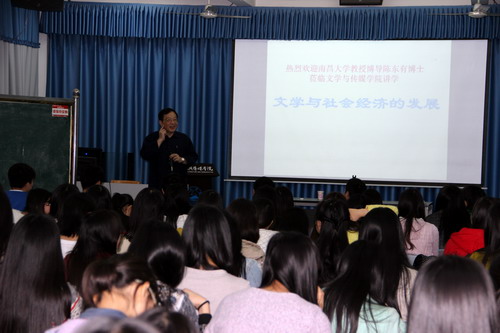 4月23日上午,文友樓203教室座無虛席。應文傳學院邀請,江西省委宣傳部前常務副部長、南昌大學博導陳東有教授來到文傳學院,作了題為“文學與社會經濟的發展”的專題報告。文傳學院黨委書記湯紅蓮出席報告會。文傳學院漢語言文學、語文教育等相關專業師生100余人聆聽報告。報告會由文傳學院副院長江臘生博士主持。