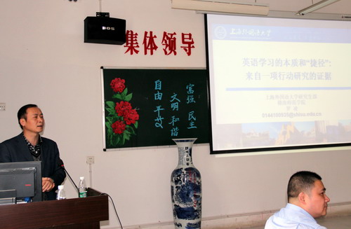 4月24日下午,應外國語學院邀請,上海外國語大學博導、上海外語音像出版社社長陳堅林教授和他的博士團隊一行四人來到外國語學院。并在香遠樓315舉行了“中國外語教學多維研究”博士沙龍。副校長陶春元出席博士沙龍并對陳堅林博士團表示熱烈歡迎,陶春元副校長提出外語學院的教師應當珍惜陳堅林教授博士團隊的親身指導,希望此次博士沙龍能激發教師思維的火花。
