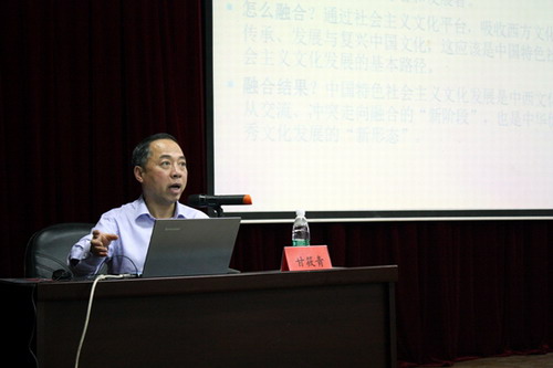 4月27日下午,校長甘筱青到文理實驗樓看望“向學青年”大學生骨干培訓班的全體學員,觀看了班級匯報,并為全體學員做了題為《中國特色社會主義文化發展道路》的專題報告。副校長王萬山出席報告會,報告會由校團委書記閆來英主持。