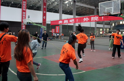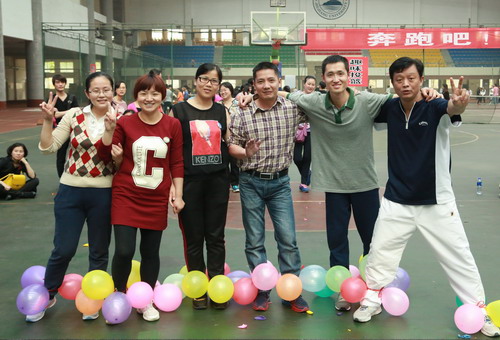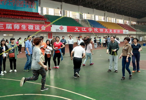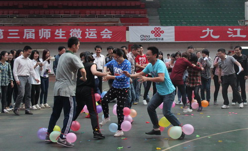 本次微運會分學生組和教工組兩類,共設(shè)立拔河、踩氣球、背夾球迎面接力、八字跳繩、撕名牌等5個師生集體項目和吹乒乓球、網(wǎng)球彈射、趣味投籃、踢鍵子等6個個人項目。比賽中,師生同場競技,互相“圍觀”,使老師能更好感受到青年學子的朝氣蓬勃,也使學生看到老師團結(jié)活潑的一面,拉近了師生距離,增進了友誼,加強了團結(jié)。