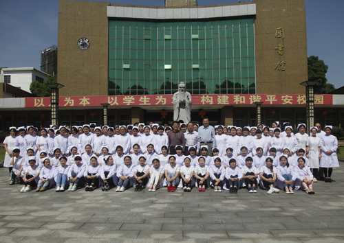 甘筱青熱情邀請師生們合影,并介紹說,之所以把合影地點選在孔子雕像前,就是希望護理學院的師生們既要繼承南丁格爾救死扶傷的人道主義精神,更要弘揚孔子仁愛天下的儒家思想。