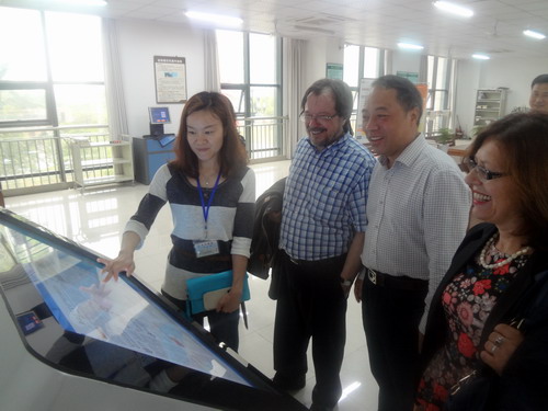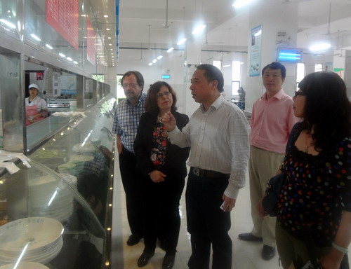 甘校長首先向法國訪客介紹了八里湖校區利用社會公共體育資源的辦學特色,既提高了體育教學質量,又更好的利用了社會資源。在甘校長的引領下,法國訪客先后參觀了校區圖書館、室內體育館、學術報告廳、學生食堂、學生公寓等場所,期間甘校長全程用法語向客人進行了詳細的介紹。