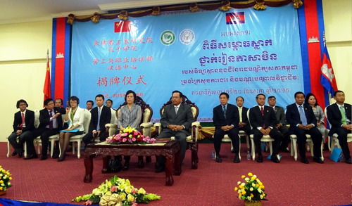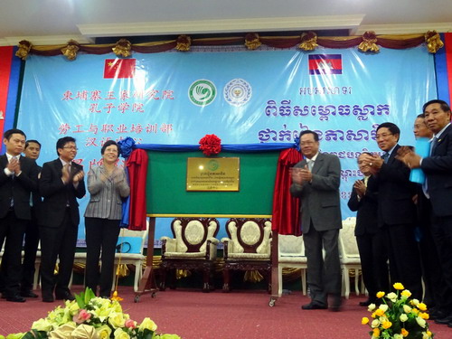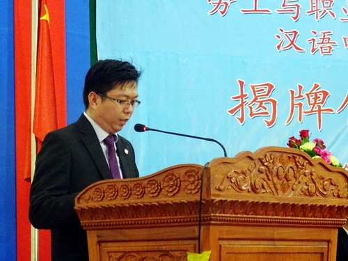 致辭結束后,布建國大使與毅森興部長共同為柬埔寨王家研究院孔子學院勞工部漢語中心揭牌。