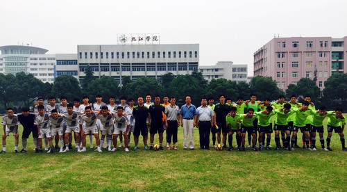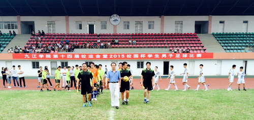 5月25日下午,九江學院第十四屆校運會暨2015校園杯男子足球比賽在主校區南區足球場順利拉開帷幕。副校長陶春元與學生處、校團委、體育學院相關負責人以及參賽球隊領隊出席了開賽儀式。