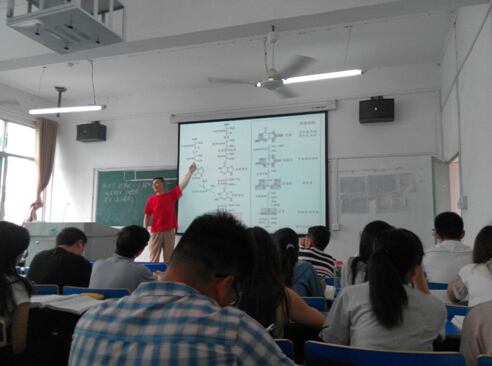 課堂上,涂巖老師對“嘌呤的降解”過程進行了詳細的講解。涂老師講解過程語言形象生動,板書與多媒體相輔相成,并不時與學生互動,課堂效果良好。魏書記與同學們一起專注聽課,并認真地做著聽課記錄。