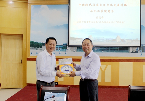 簡短而熱烈的歡迎會結束,校領導與泰中華文教育基金會會長魏青互贈紀念品并合影留念。而后,甘筱青校長作了題為“中國特色社會主義文化發展道路”講座。從中華歷史中分析中華文化發展道路,橫向縱向的對比中華文化發展的利弊,最后肯定社會主義核心價值觀的現實意義,總結如今的文化發展的三大戰略任務:一、“以理服人”,提升國際話語力;二、堅持中西交融,開展文明對話;三、創新傳播體系,重建社會信仰。講座后,校長甘筱青也對九院做了簡單的介紹,希望泰方校董能對位于廬山之麓、長江之濱、鄱陽湖之畔的九院留下美好的初印象。