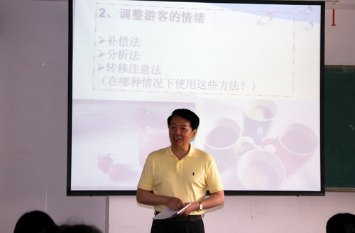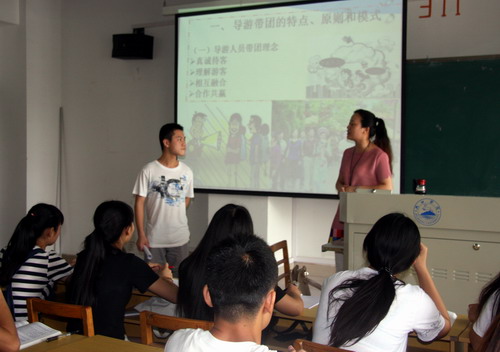 課堂上,喬秋敏副教授圍繞“導(dǎo)游帶團(tuán)原則”、“導(dǎo)游帶團(tuán)節(jié)奏控制”、“游客情緒控制”等內(nèi)容進(jìn)行了細(xì)致講解,通過(guò)提問(wèn)、互動(dòng)、舉例、情境教學(xué)等方式,讓同學(xué)們輕松掌握了主要知識(shí)點(diǎn)。