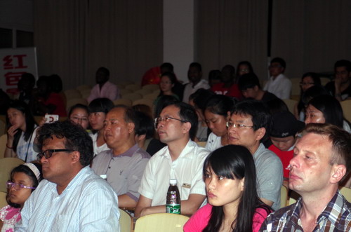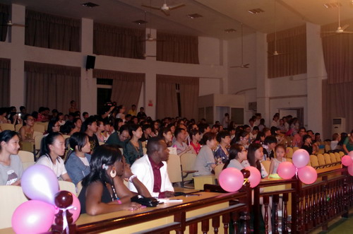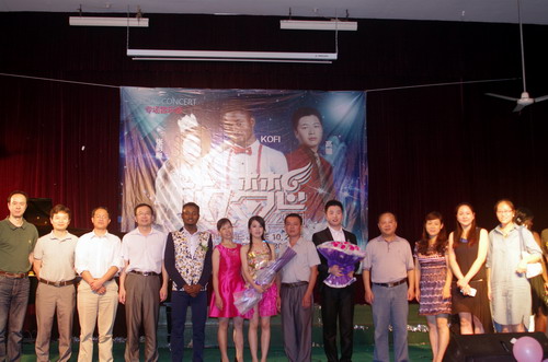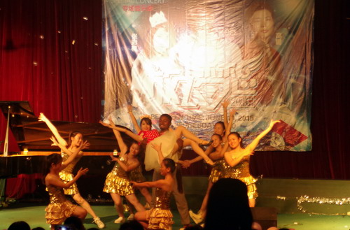 音樂會的帷幕在高瞻帶來的京劇反串《霸王別姬》“看大王、勸君王”的選段中被拉開,男聲獨唱《父親》、《拉住媽媽的手》在表演者高瞻專業性的演唱技巧中,濃濃的親情被表現得淋漓盡致,勾起在坐同學們對親人的思念;本場音樂會形式多樣,不僅是歌曲的演唱,鋼琴獨奏、歌伴舞、長號獨奏、銅管五重奏等節目的表演也讓觀眾們耳目一新。還有藝術學院教師蔡圓圓友情助陣,帶來鋼琴四手聯彈,默契的配合宛如只有一人在彈奏。在會場閃爍的燈光下,音樂會的氣氛逐漸推向高潮,張彩柳和kofi聯手帶來的歌舞劇《遠方》,好似傾訴了一場憂傷的愛情故事,kofi來自國際交流學院的加納籍學生,但他對中文歌曲的演唱卻毫不遜色,引來在坐觀眾的雷鳴般的掌聲,更有來自國際交流學院的同學們的加油助陣,把音樂會的氛圍推向了高潮。