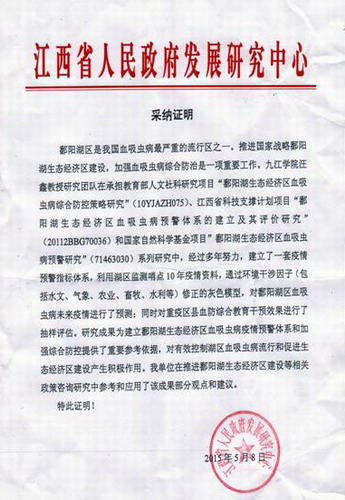 我?;A醫學院汪鑫教授研究團隊在承擔教育部人文社科研究項目“鄱陽湖生態經濟區血吸蟲病綜合防控策略研究”、江西省科技支撐計劃項目“鄱陽湖生態經濟區血吸蟲病預警體系的建立及其評價研究”和國家自然科學基金項目“鄱陽湖生態經濟區血吸蟲病預警研究”系列研究中,經過多年努力,建立了一套疫情預警指標體系,研究成果為建立鄱陽湖生態經濟區血吸蟲病疫情預警體系和加強綜合防控提供了重要參考依據,相關研究成果已被江西省人民政府發展研究中心采納。