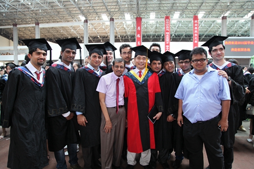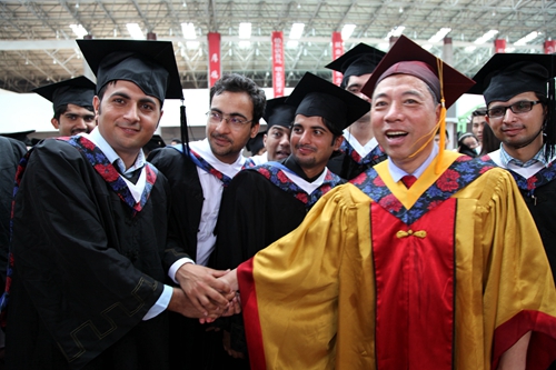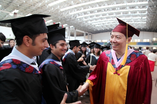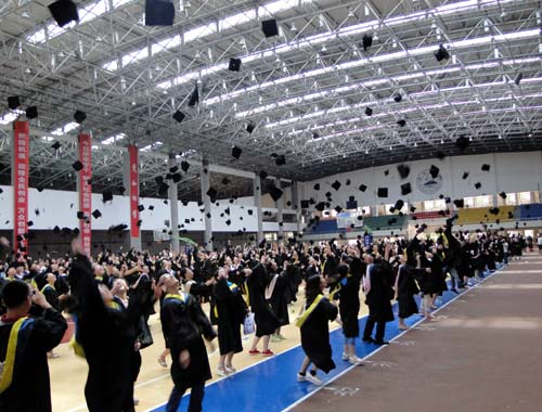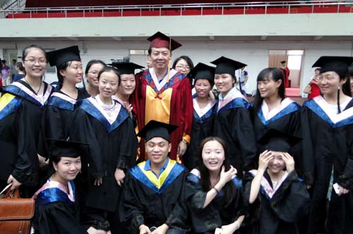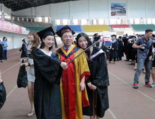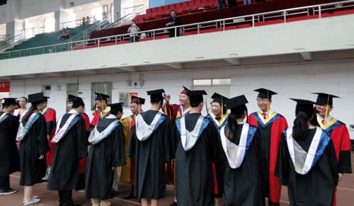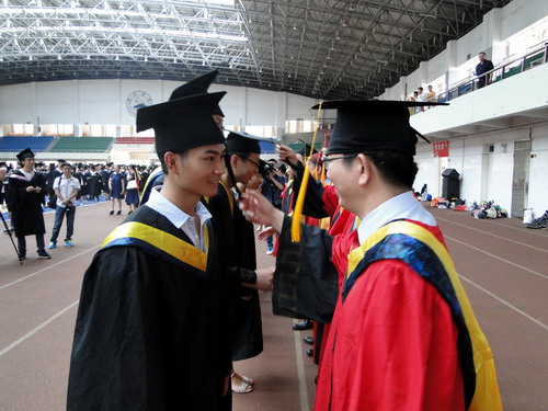各二級學院領導和機關各部門負責人也分別走入畢業生隊伍中,為全體畢業生扶正學位帽,撥轉流蘇。畢業生滿懷激動,逐一快步趨前,向導師深深地鞠躬。整個會場氣氛熱烈、喜氣洋洋,難忘的時刻凝聚在每個同學的笑臉上。