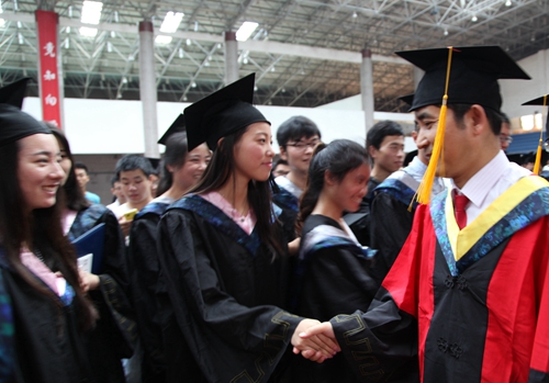 接著,在莊嚴神圣的氣氛中,舉行了隆重的學位授予儀式。伴隨著歡快的音樂,身著鮮紅導師服的全體校領導健步走到列隊等候的畢業生隊伍前,親手為48名身著學士學位服的學生代表一一正冠撥蘇,并與他們握手和合影留念。莊嚴的學士服與張張青春朝氣的笑臉交相輝映,豪情壯志激蕩在每位畢業學子的心中。陽光自信的九江學院學子,身著端莊穩重的學士服,整裝待發。鞠躬、握手、擁抱,他們用最真誠的方式來感謝母校、感謝師長,他們用最動人的微笑為大學四年的學習歷程劃上了圓滿的句點。