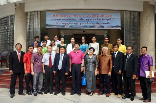 6月23日上午,柬埔寨王家學院孔子學院官員班訪華團歡迎儀式在我校行政樓四號會議室隆重舉行,校長甘筱青、副校長楊耀防、柬埔寨內閣辦公廳副國務秘書布林興(BUON LIMHENG)、圖素琨(TUNG SOKUN)、柬埔寨孔子學院柬方院長謝莫尼勒(CHEA MUNYRITH)、參議院行政與財政司副司長金索帕(KIM SOPHA)、國際交流學院院長夏修龍、外國語學院院長韓琨、文傳學院朱全國副院長、國際處王賢淼副處長、訪華團其他成員、我校柬埔寨留學生和有志于今后赴柬埔寨孔子學院任教的的外國語學院師生等共50多人出席了歡迎儀式。儀式由王賢淼副處長主持。