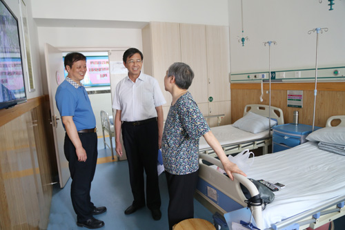 視察中,蔣如銘親切慰問臨床醫學院/附屬醫院醫護人員,并和藹地和住院病友交談。來到內分泌病區,蔣副主任仔細詢問患者王阿姨在醫院的就醫情況、住院環境感受和身體恢復情況。王阿姨高興地說:“謝謝領導關心,我現在恢復得很好,在附屬醫院看病很放心,醫生都能根據我的具體情況用醫用藥,護士服務和善周到,而且現在住院條件很好、整潔干凈,跟在家一樣,現在天氣熱,空調等各種供應都很好很舒服”。蔣副主任詳細、認真地了解臨床醫學院/附屬醫院醫療服務質量安全等各項工作后,留下了深刻的印象,非常贊賞臨床醫學院/附屬醫院現階段取得的顯著成就。