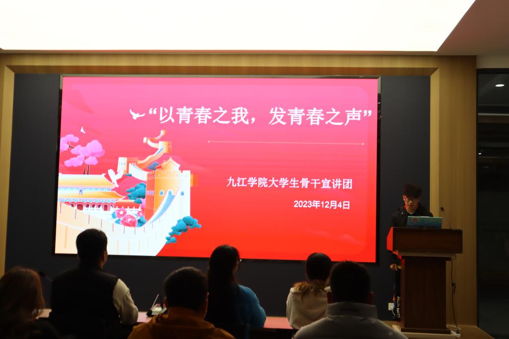 “同學們,以中國式現代化全面推進中華民族偉大復興的新藍圖已然繪就,長江之舟,乘勢而上,廣大青年必須挺膺擔當,以更加自信自強的精神姿態保護好、傳承好長江文化,助力長江之舟劈波斬浪,推動中國式現代化行穩致遠。”12月4日晚,在九江學院大學科技園研討室內,九江學院青馬宣講團成員張思軒的話音剛落,報告廳內立即響起熱烈的掌聲。