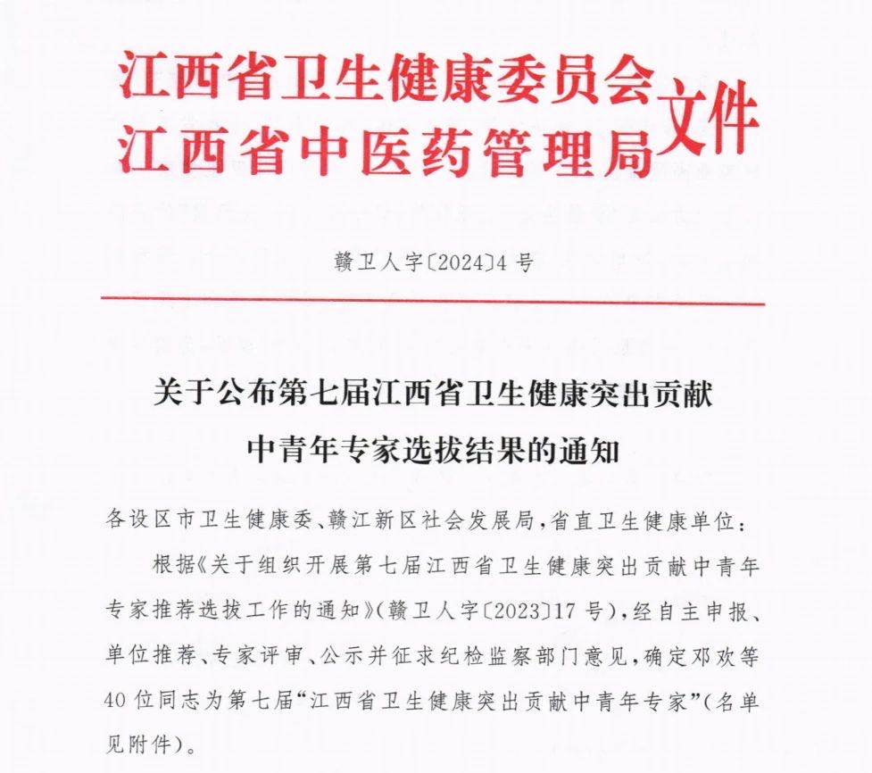 據悉,“江西省衛生健康突出貢獻中青年專家”是由省衛健委牽頭,經自主申報、單位推薦、專家評審及公示等環節進行評選的省級人才榮譽稱號。獲評人員是在全省衛生健康系統內從事醫療、預防、疾控、保健、科研及中醫藥等領域工作中作出貢獻,創造出顯著社會、經濟效益的中青年專業人才。