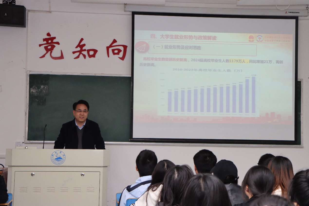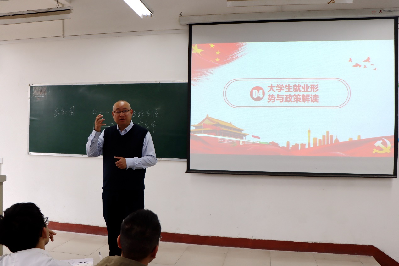李明斌在課堂上與同學(xué)們充分互動(dòng),以一名師長的情懷娓娓道來,以豐富的數(shù)據(jù)深入淺出地解讀了近年來高校畢業(yè)生就業(yè)整體形勢,希望廣大同學(xué)要對(duì)就業(yè)形勢有清醒的認(rèn)識(shí),要積極適應(yīng)市場的變化,合理設(shè)定就業(yè)目標(biāo),要提高自身就業(yè)能力,要熟悉了解并用好國家、省、市、學(xué)校支持畢業(yè)生就業(yè)創(chuàng)業(yè)政策,要用好各類求職招聘平臺(tái),要積極投入到學(xué)校的各類線下招聘活動(dòng)中去,要抓住求職過程中的先機(jī),早決定早上崗,在和時(shí)代的同向而行中實(shí)現(xiàn)個(gè)人與時(shí)代的共同成就。