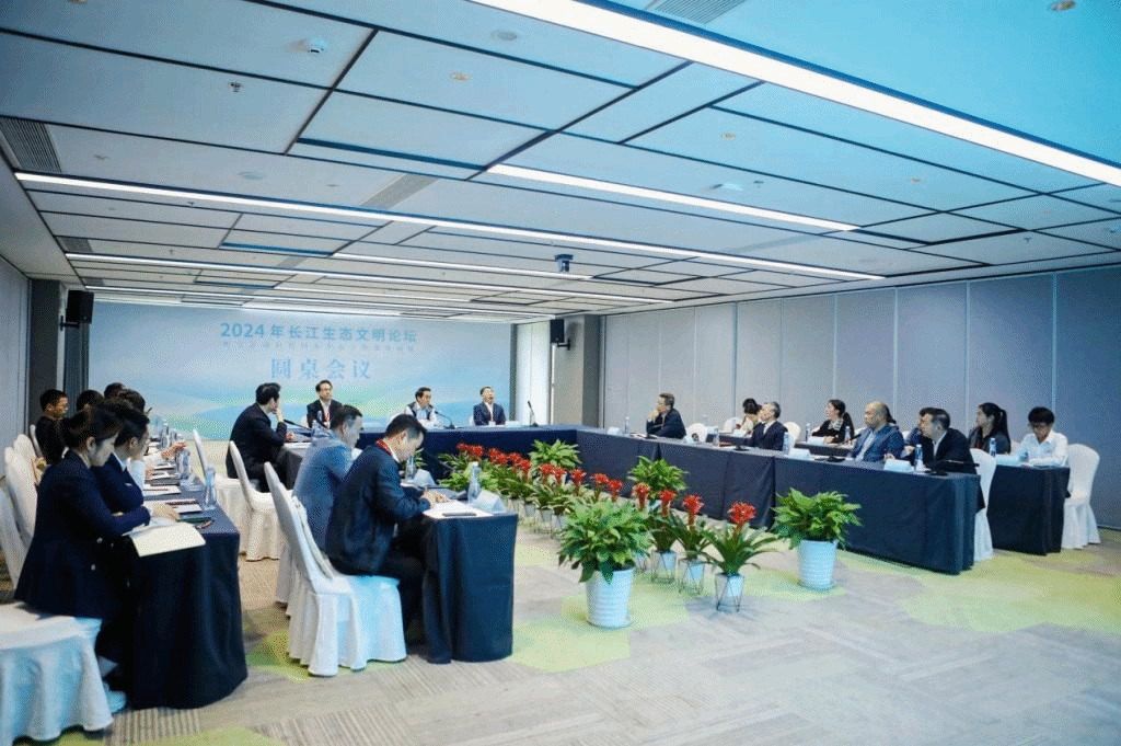 圓桌會議環節,中國工程院院士任南琪教授、中國工程院院士馬軍教授,九江學院黨委書記李明斌教授,江西省生態環境監測中心副主任儲險峰,九江市生態環境局黨委書記、局長張南,中國科學院南京地理與湖泊研究所徐力剛研究員,江蘇長江經濟帶研究院院長成長春教授,南昌大學劉耀彬教授,江西省林業局二級巡視員郭英榮、中國石化九江分公司唐安中教授級高工分別就長江經濟帶高質量發展、綠色發展、生態文明教育等主題作交流發言。