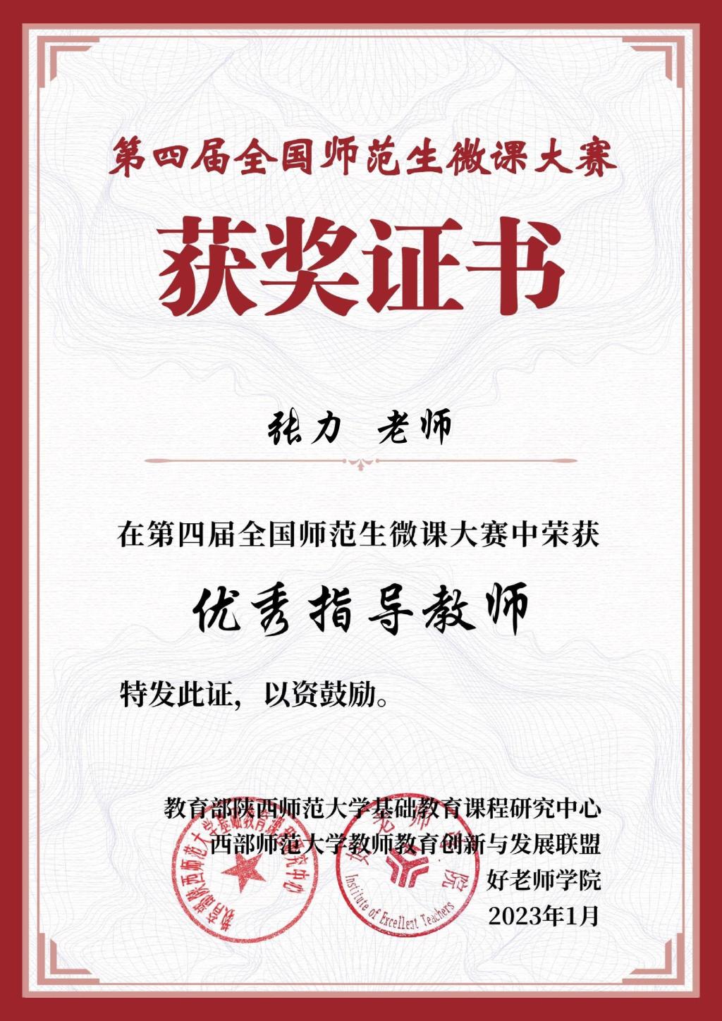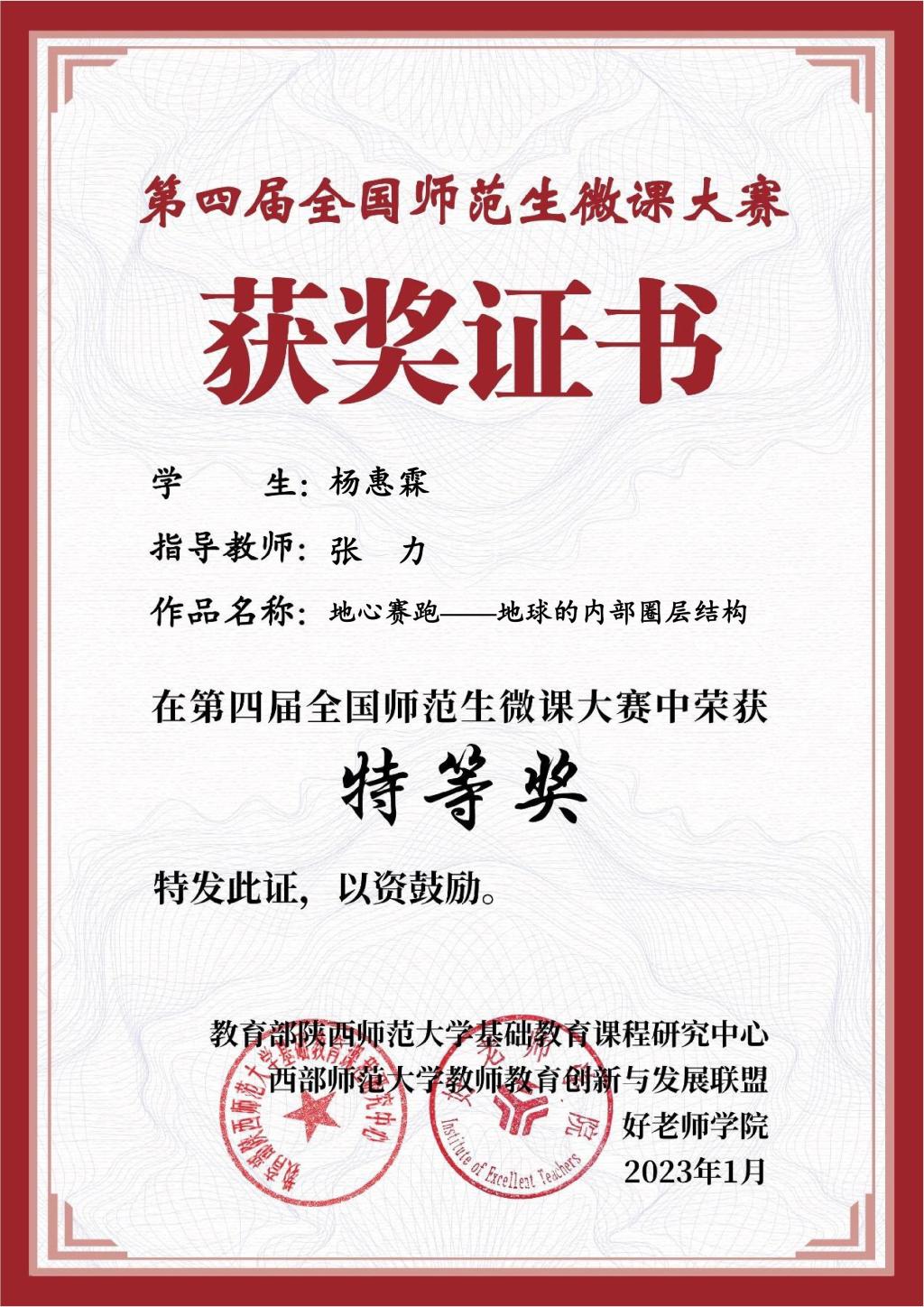 為了進一步推動這些優秀同學的成長,張力積極分享學院及省級、國家級教學比賽信息,主動對接具有潛力的學生,并悉心輔導他們參加比賽。在師生的共同努力下,學生取得了顯著的成績,任淇琪同學在“田家炳杯”第八屆全國師范院校師范生教學技能競賽中榮獲二等獎,楊惠霖同學在第四屆全國師范生微課大賽中獲得特等獎。
