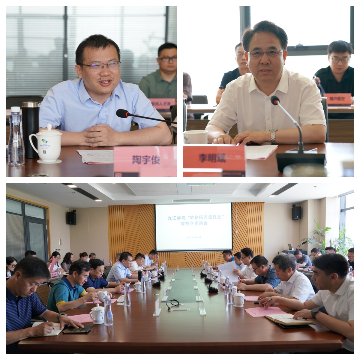 雙方在鄱陽湖生態科技城會議室召開政校企座談會,雙方領導與14家入駐濂溪區產業園和鄱陽湖生態科技城的企業代表開展座談。政校企三方代表圍繞合作辦學、就業實習基地建設、學生留潯就業等方面進行了富有建設性的探討交流。