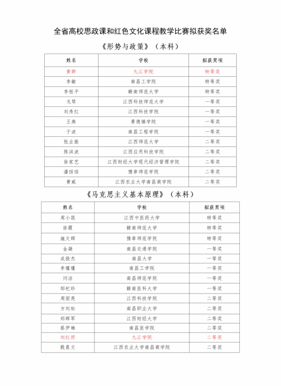 近日,九江學院參加教學比賽再傳捷報,我校馬克思主義學院教師在2024年度江西省高校思政課和紅色文化課程教學比賽中取得了傲人成績,黃群老師獲《形勢與政策》課程比賽特等獎第一名,劉紅雨老師獲《馬克思主義基本原理》課程比賽二等獎,為九江學院贏得了榮譽。