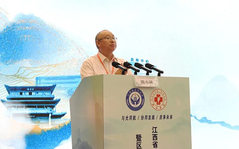 陳小林致辭,他指出,九江學院附屬醫院要順應新時代醫療衛生事業的新要求,不斷深化內部改革,強化醫療技術創新,提升醫療服務質量,努力構建集預防、診療、康復于一體的全方位、全周期健康服務體系,強化醫院信息化建設,優化患者就醫體驗,讓醫療服務更加便捷、高效、人性化。