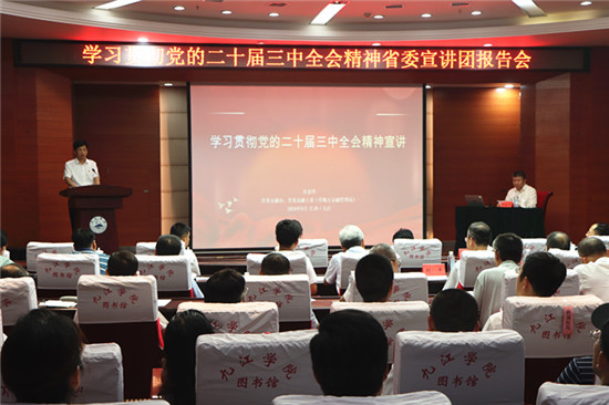 按照省委統一安排,8月19日,學習貫徹黨的二十屆三中全會精神省委宣講團報告會在我校逸夫圖書館報告廳舉行。省委宣講團成員、省委金融辦分管日常工作的副主任、省委金融工委主持日常工作的副書記、省地方金融管理局局長許忠華作宣講報告。校領導、全校副處級以上干部、民主黨派負責人、思想政治理論課教師、學生代表等180余人在主會場參加了報告會,全校各單位師生1000余人通過在線直播參會。報告會由校黨委委員、副校長查振華主持。