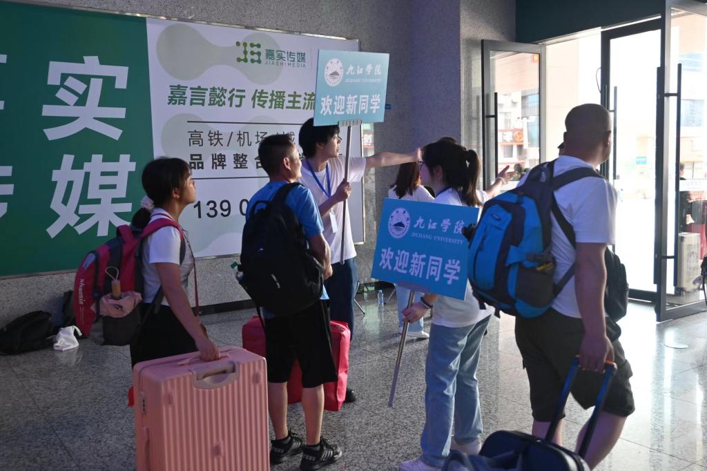 “九江學院的新同學來這邊!學長學姐接你們去學校啦!”學校在九江站和廬山站分別設立迎新點,接站志愿者現場組織引導新生和家長有序乘坐迎新專車前往學校報到。在各個接站點,志愿者在指定的車站出站口舉牌等候新生、協助新生及家長搬運行李,引導他們前往接待點進行信息登記。