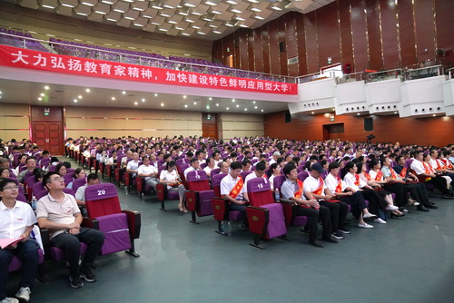 興國必先重教,重教必先強師。9月9日上午,我校在大禮堂召開慶祝第40個教師節暨表彰大會。學校2023-2024學年優秀教師代表、優秀教育工作者代表、優秀輔導員代表、優秀班主任代表、先進集體代表、長期從教教師代表、新入職教師代表,師生代表,各職能部門主要領導、各學院黨政主要領導等共計500余人參加大會。