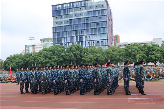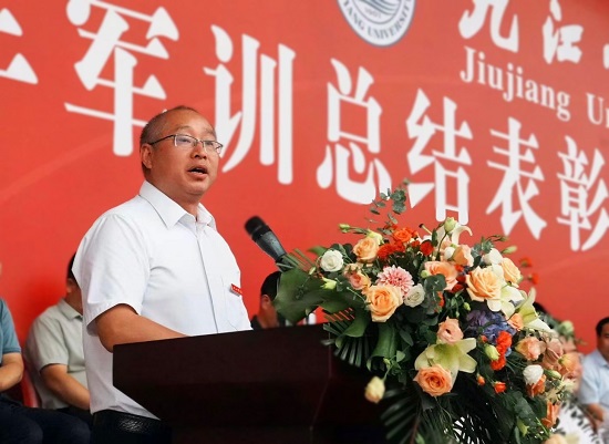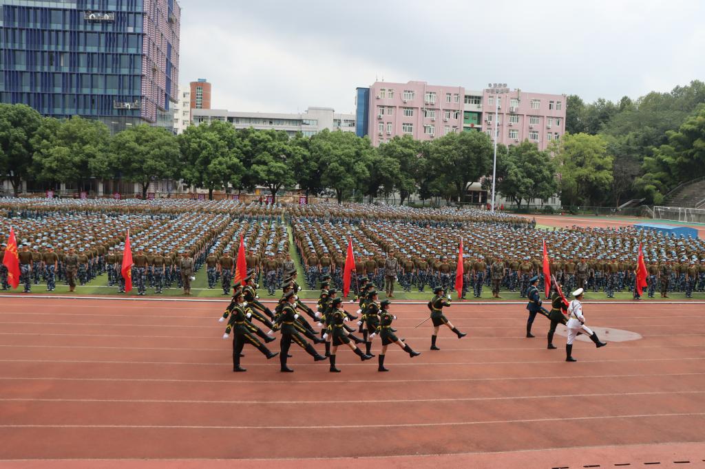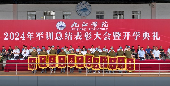 武警九江支隊預提指揮警士集訓隊隊長袁宋宣布軍訓會操、內務評比表彰決定,學生工作處處長、軍訓旅政委吳鈴宣布軍訓優秀學員表彰決定。主席臺領導為獲得表彰的先進集體、優秀學員頒發錦旗和榮譽證書。