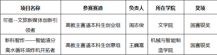 我校文學院《可宿--文旅新媒體創新引領者》和機械與智能制造學院《新科智炸——智能渣分離水循環油炸機開拓者》2個項目推薦進入國賽總決賽,并全部晉級現場賽,最終榮獲國賽銀獎,這是我校自2015年大賽啟動以來,繼2021年首次突破國賽銅獎后的又一次突破。這次充分了體現我校深化創新創業教育改革和探索在以創新創業人才培養為導向的應用型人才培養新模式取得的重要成果。