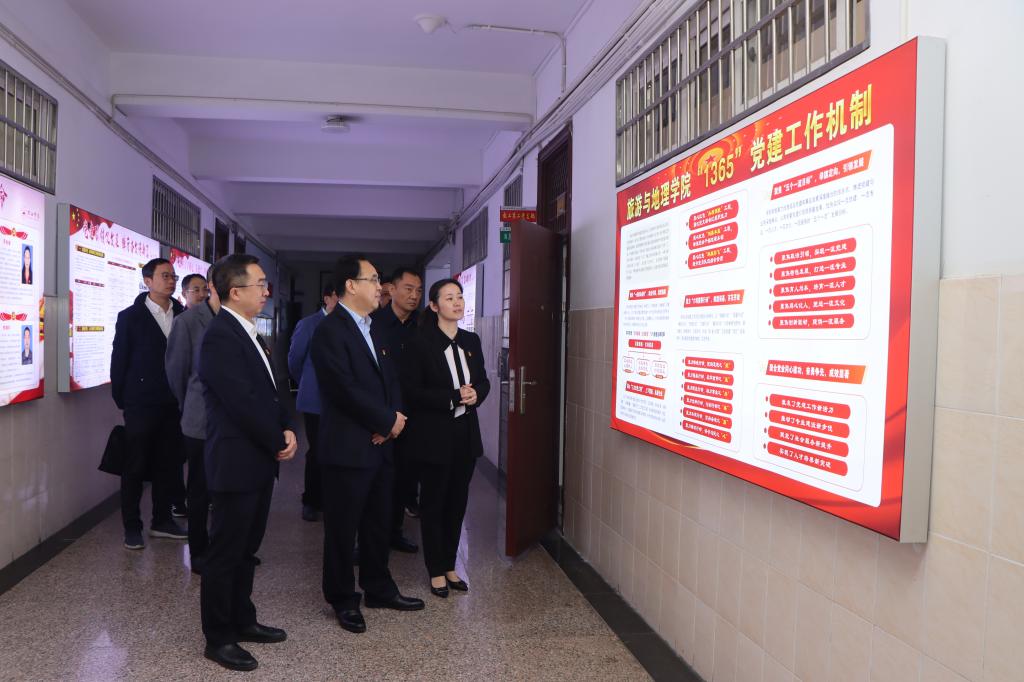 李明斌首先參觀了旅游與地理學院黨建與文化建設展示櫥窗,走訪了學院教工第二黨支部黨員活動場所,詳細了解學院黨建和文化建設情況。