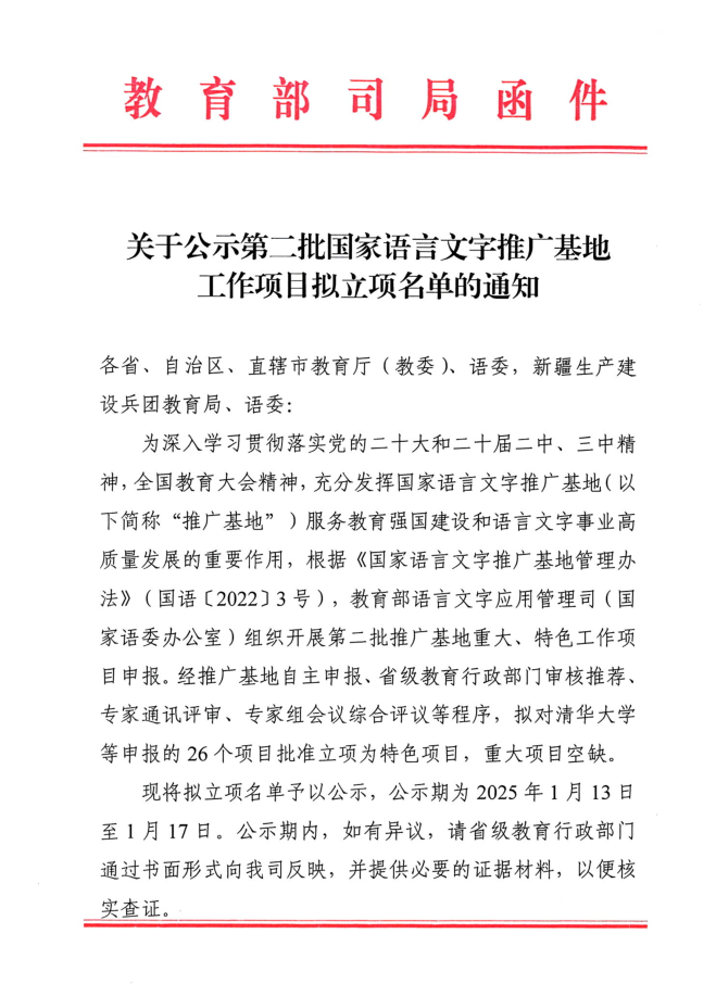 為深入學習貫徹落實黨的二十大和二十屆二中、三中全會精神,充分發揮國家語言文字推廣基地服務教育強國建設和語言文字事業高質量發展的重要作用,教育部語言文字應用管理司(國家語委辦公室)根據《國家語言文字推廣基地管理辦法》(國語〔2022〕3號),組織開展了第二批推廣基地重大、特色工作項目的申報與評審工作。經過自主申報、省級教育行政部門審核推薦、專家通訊評審及專家組會議綜合評議,全國共有26個項目獲批為特色項目,重大項目空缺。