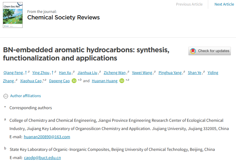 近日,我校化學化工學院有機智能材料創新團隊在硼氮有機功能分子構筑及應用研究領域取得突破進展,相關成果“BN-Embedded Aromatic Hydrocarbons: Synthesis, Functionalization and Applications”發表于國際頂級期刊《Chemical Society Reviews》(《化學會評論》)上。這是我校首次以第一完成單位在《Chemical Society Reviews》發表學術論文。化學化工學院馮強博士為該論文第一作者,黃華南教授、曹小華教授為通訊作者,北京化工大學曹達鵬教授為共同通訊作者。