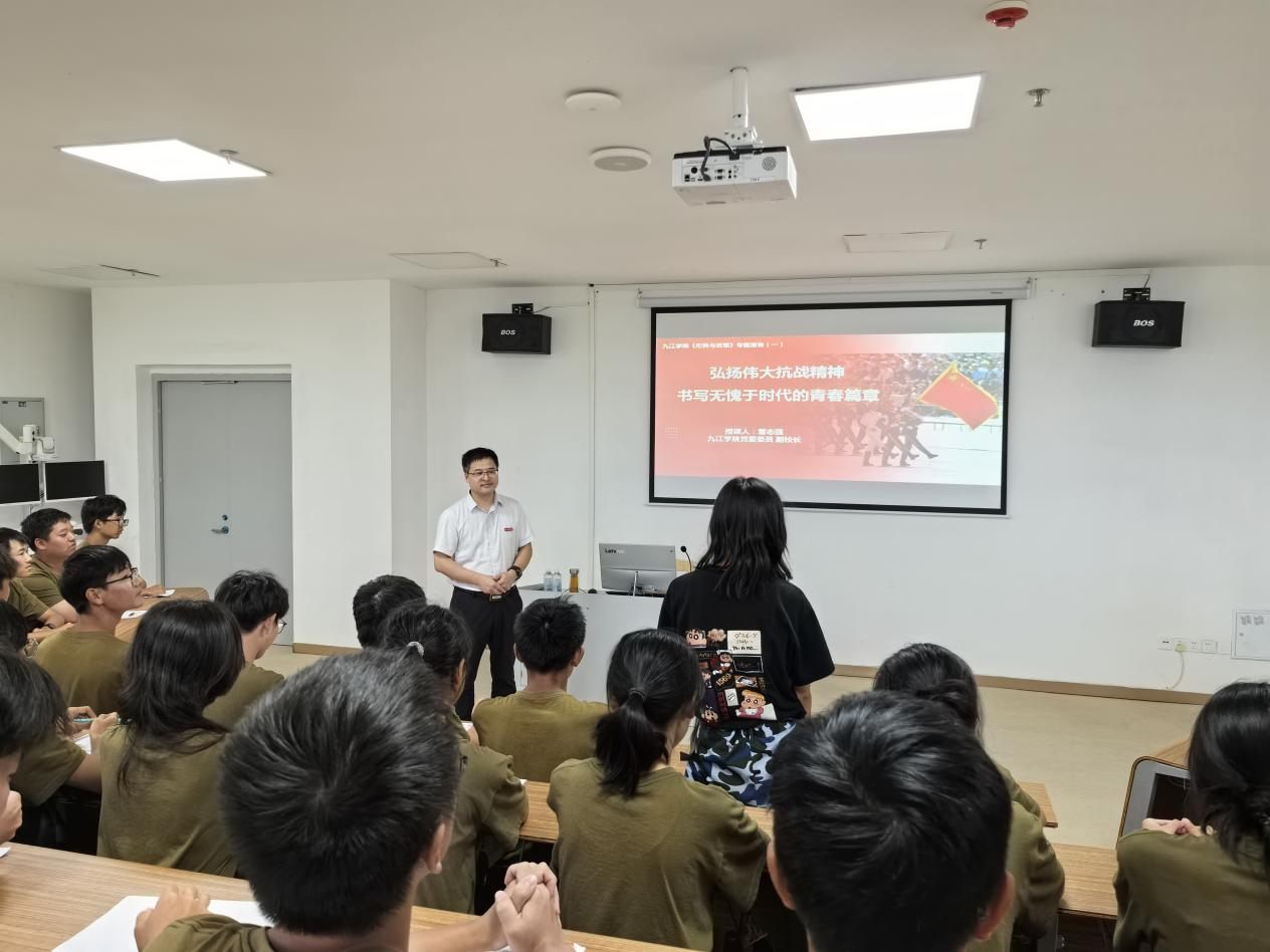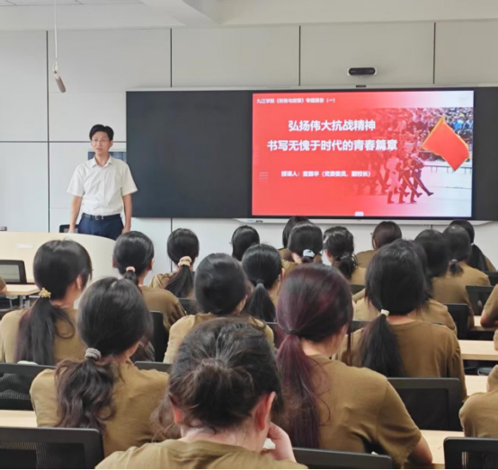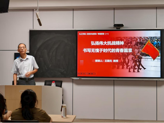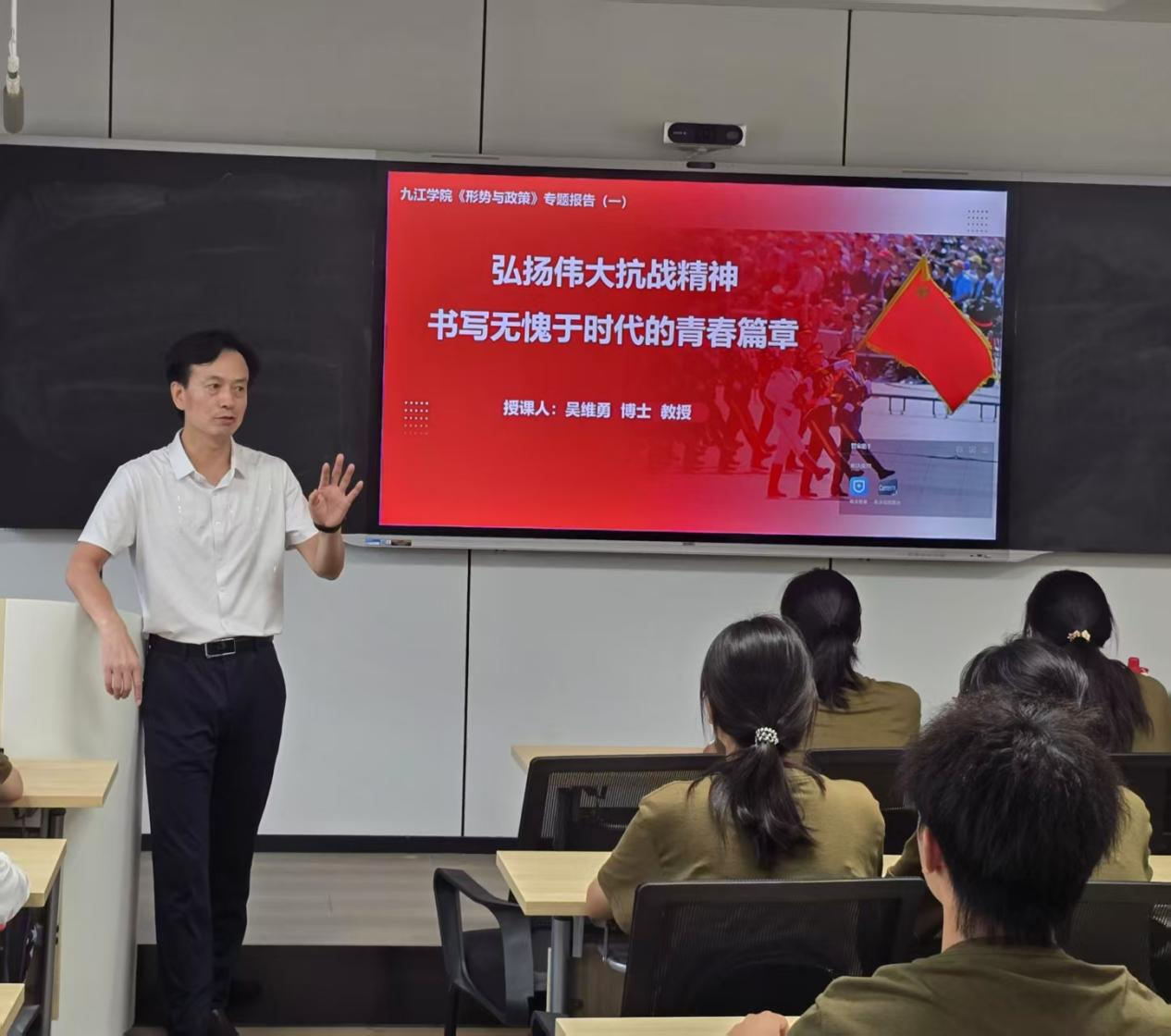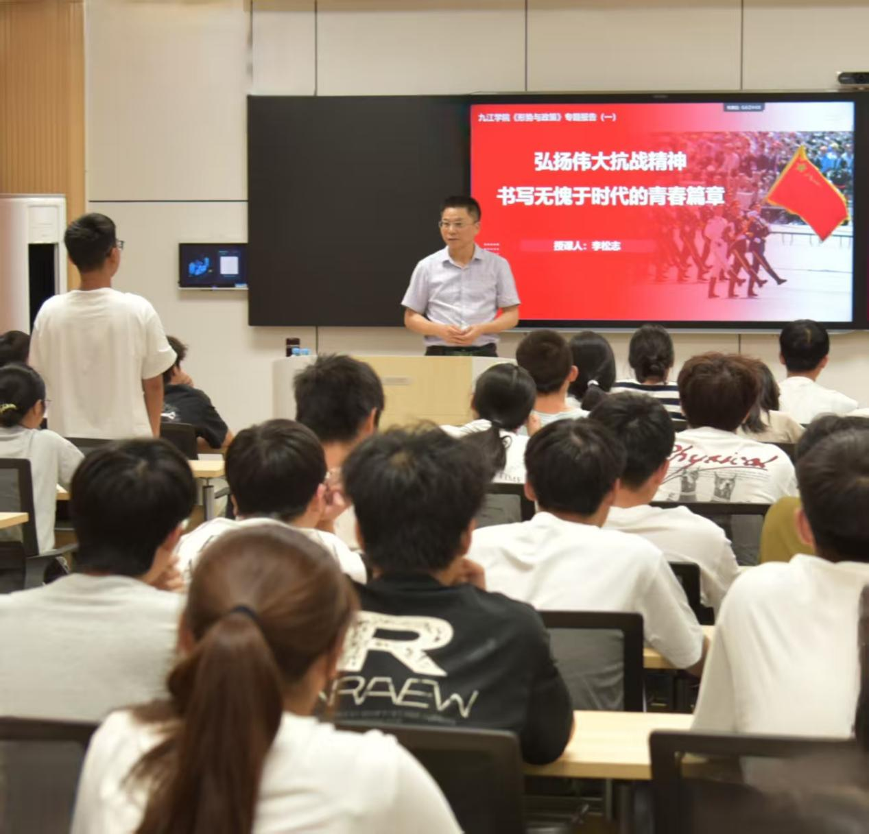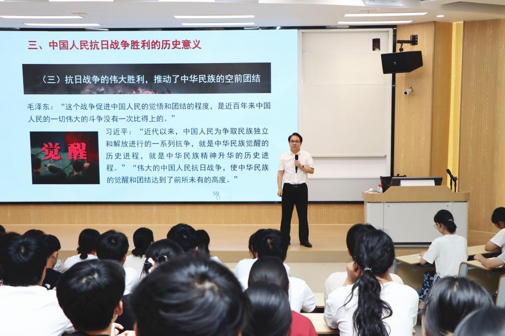 課堂上,李明斌以紀念中國人民抗日戰爭暨世界反法西斯戰爭勝利80周年大會為切入點,帶領學生重溫習近平總書記在紀念中國人民抗日戰爭暨世界反法西斯戰爭勝利80周年大會上的重要講話,觀看九三勝利日閱兵精彩瞬間,通過大量詳實數據和生動案例,系統講述了中國人民抗日戰爭的歷史進程、中國共產黨的中流砥柱作用、中國人民抗日戰爭的歷史意義、抗戰精神的歷史啟示和時代價值,勉勵大學生傳承弘揚偉大抗戰精神,涵養家國情懷,筑牢愛黨愛國、立志報國的思想根基。