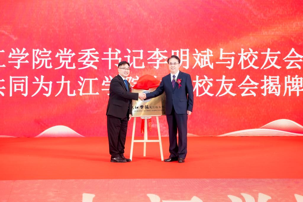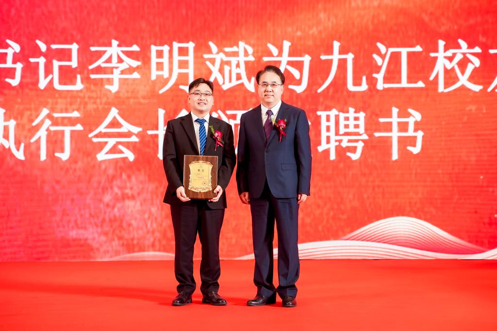 在全體嘉賓與校友的見證下,李明斌為首任會長胡甫晟頒發聘書,并共同為九江校友會揭牌。