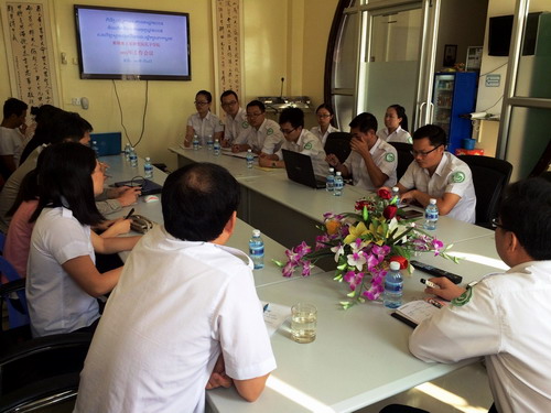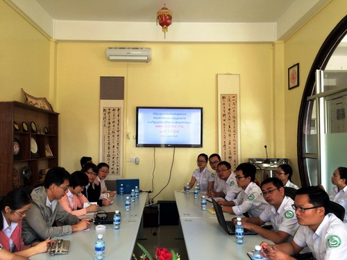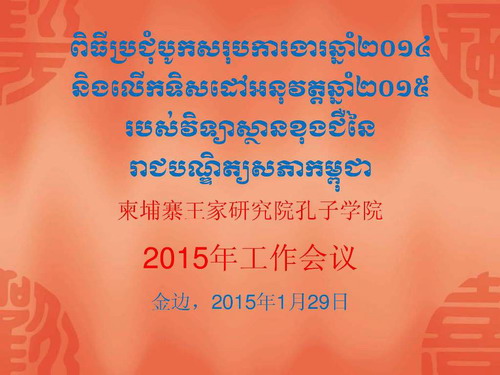 1月29日,柬埔寨王家研究院孔子學院在孔子學院大樓會議室召開2015年工作會議??鬃訉W院院長謝莫尼勒(CHEA MUNYRITH)、中方院長帥式毅,孔子課堂、中文系及漢語中心的公派漢語教師代表及在金邊的全體公派漢語教師參加了會議。會議由謝莫尼勒主持。