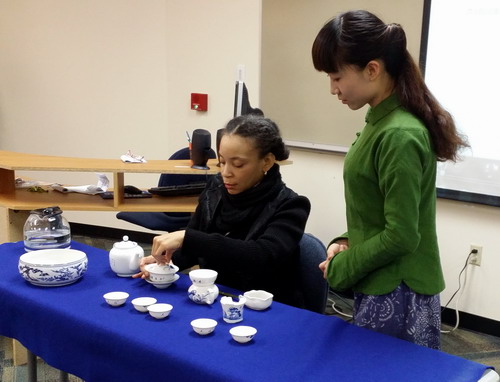 九江學院交換生席凱麗同學的茶藝表演和孔子學院張春子老師的解說讓現場的外國朋友們對淵源流長的中國茶文化也有所了解。在場的觀眾都躍躍欲試,現場學習中國茶藝。